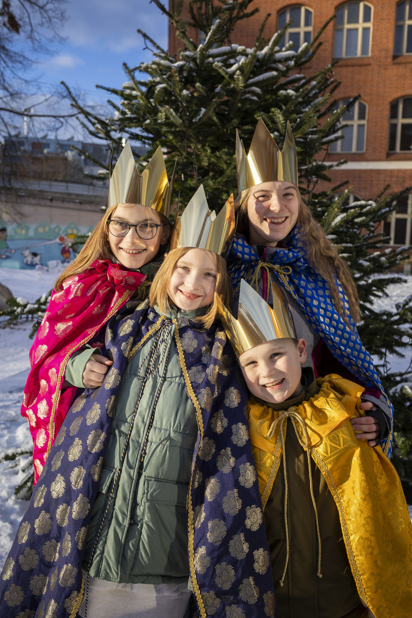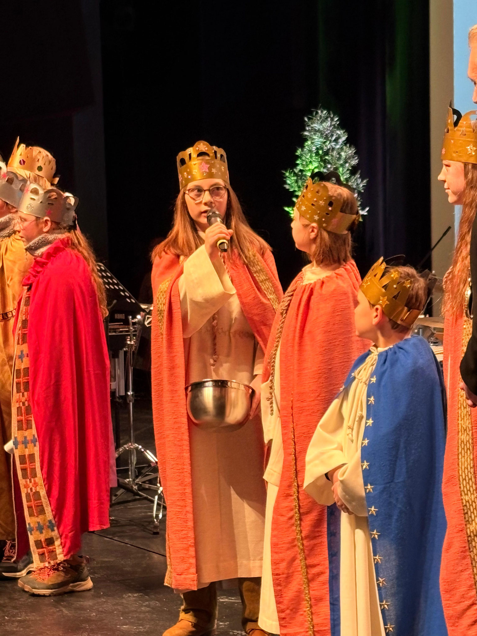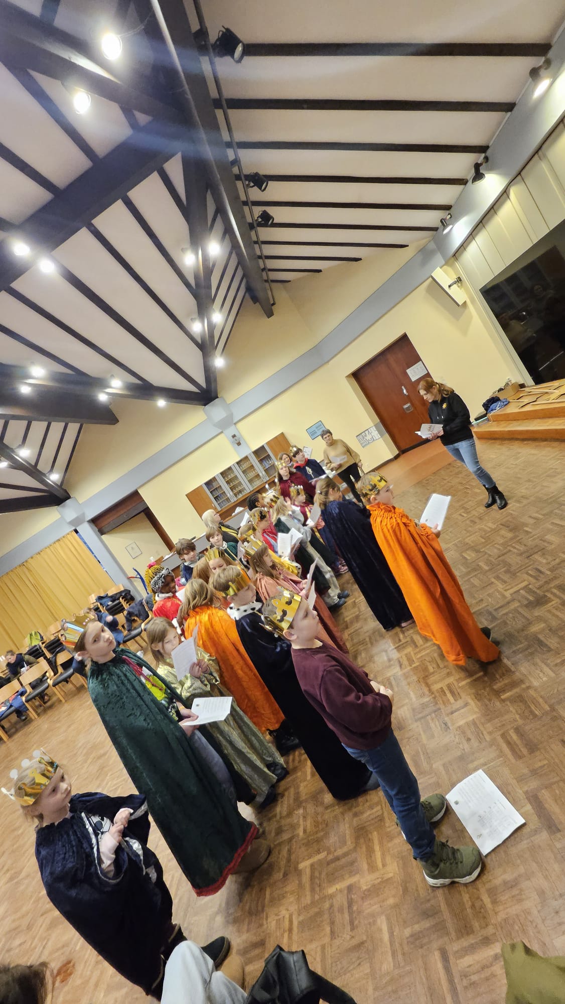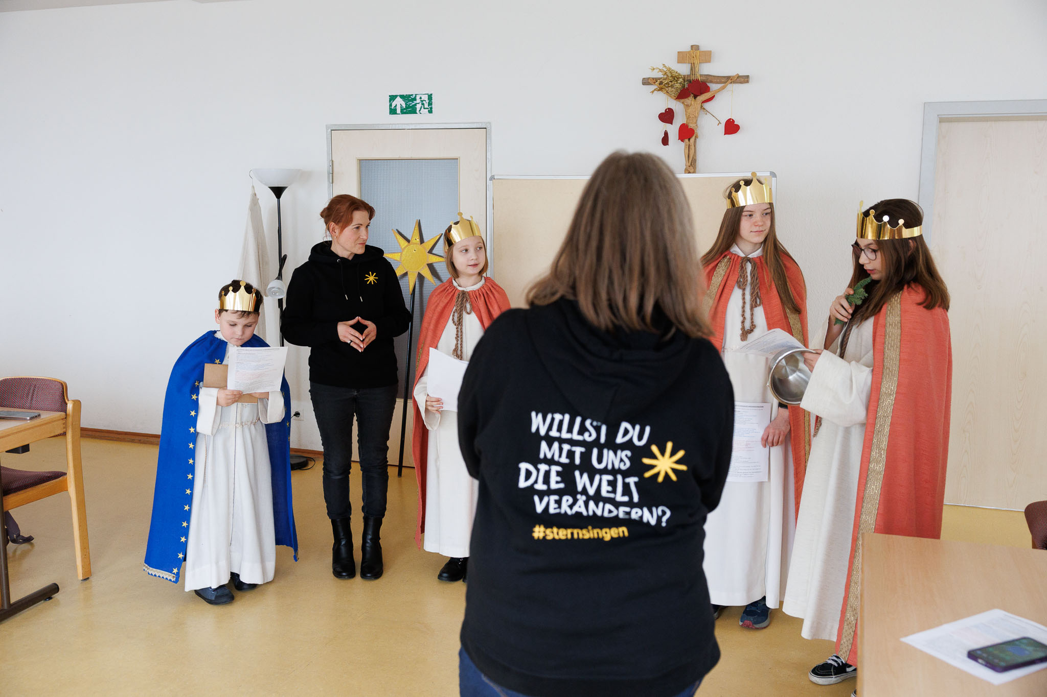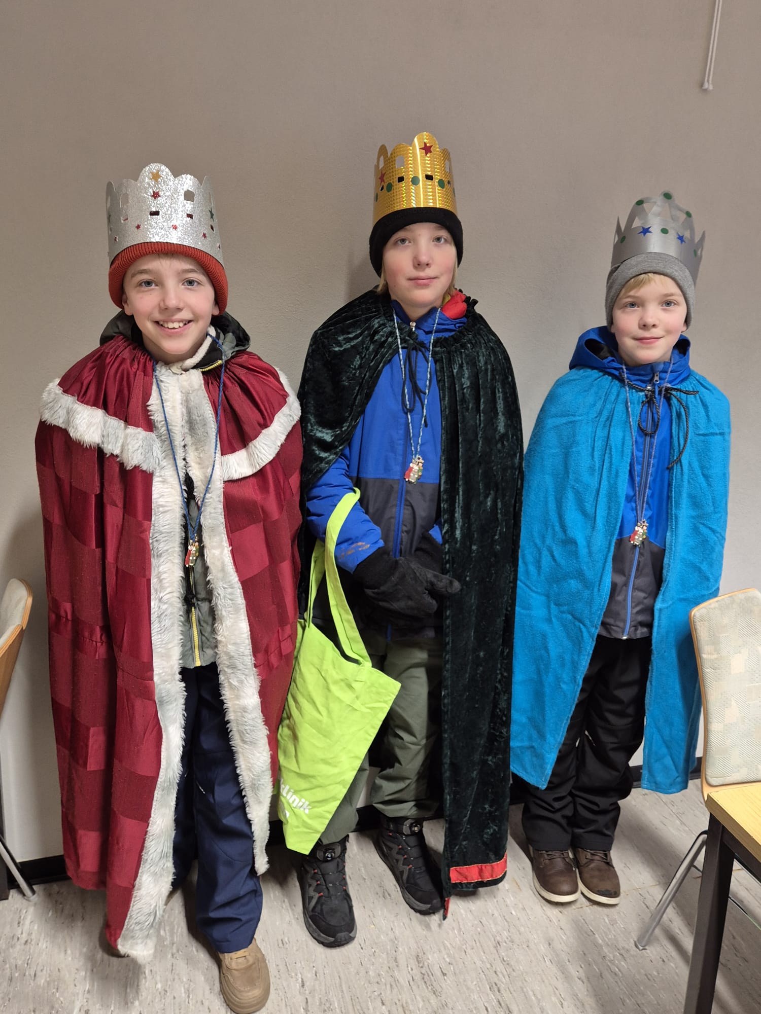 Schon bei den ersten Vortreffen war spürbar: Da liegt etwas Besonderes in der Luft. Kronen wurden anprobiert, Gewänder ausgesucht, Texte geübt und Rollen verteilt. Zwischen neugierigen Blicken in den Spiegeln, Freude und ersten „Majestätsproben“ begann die Sternsingerzeit.