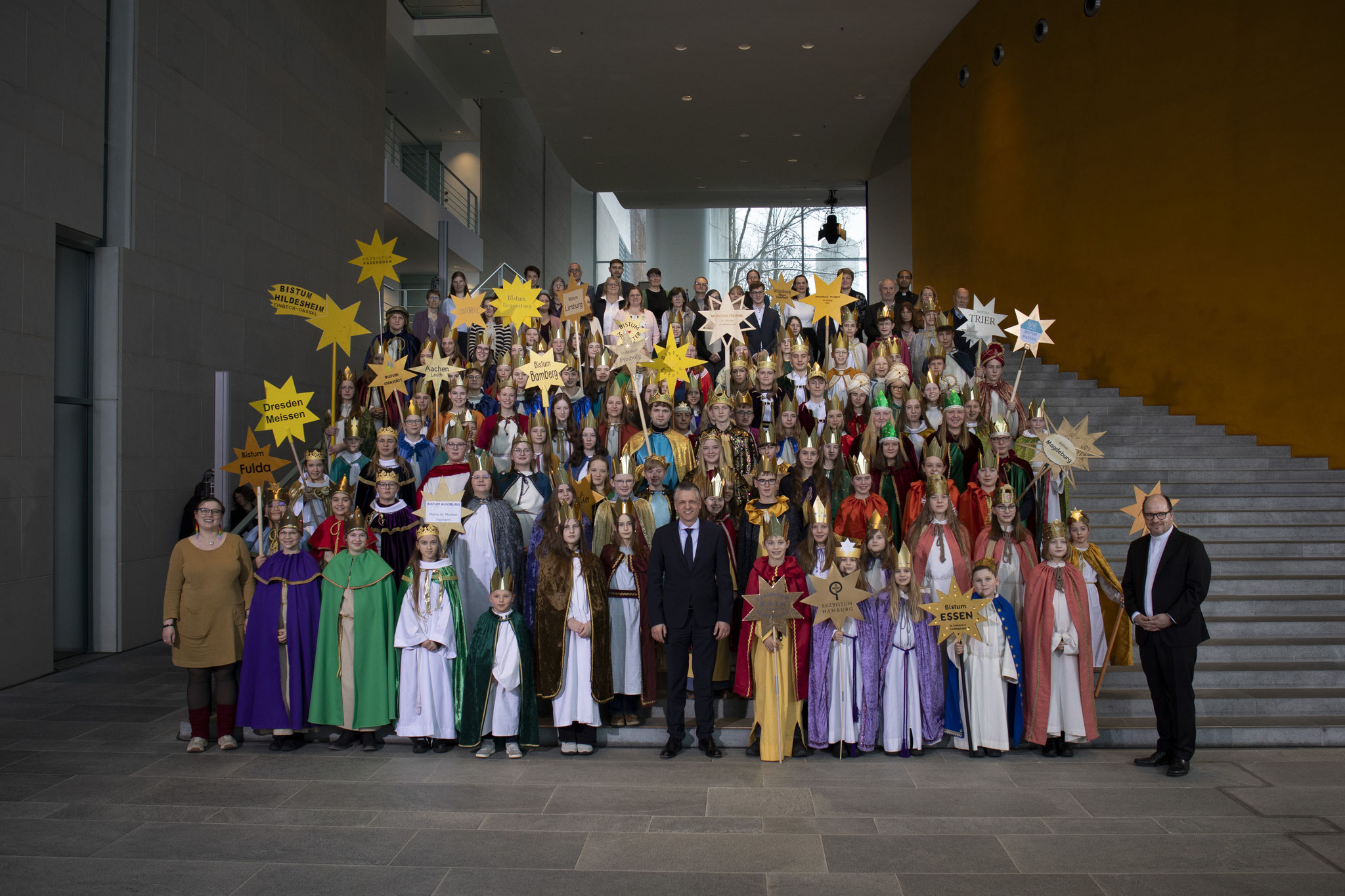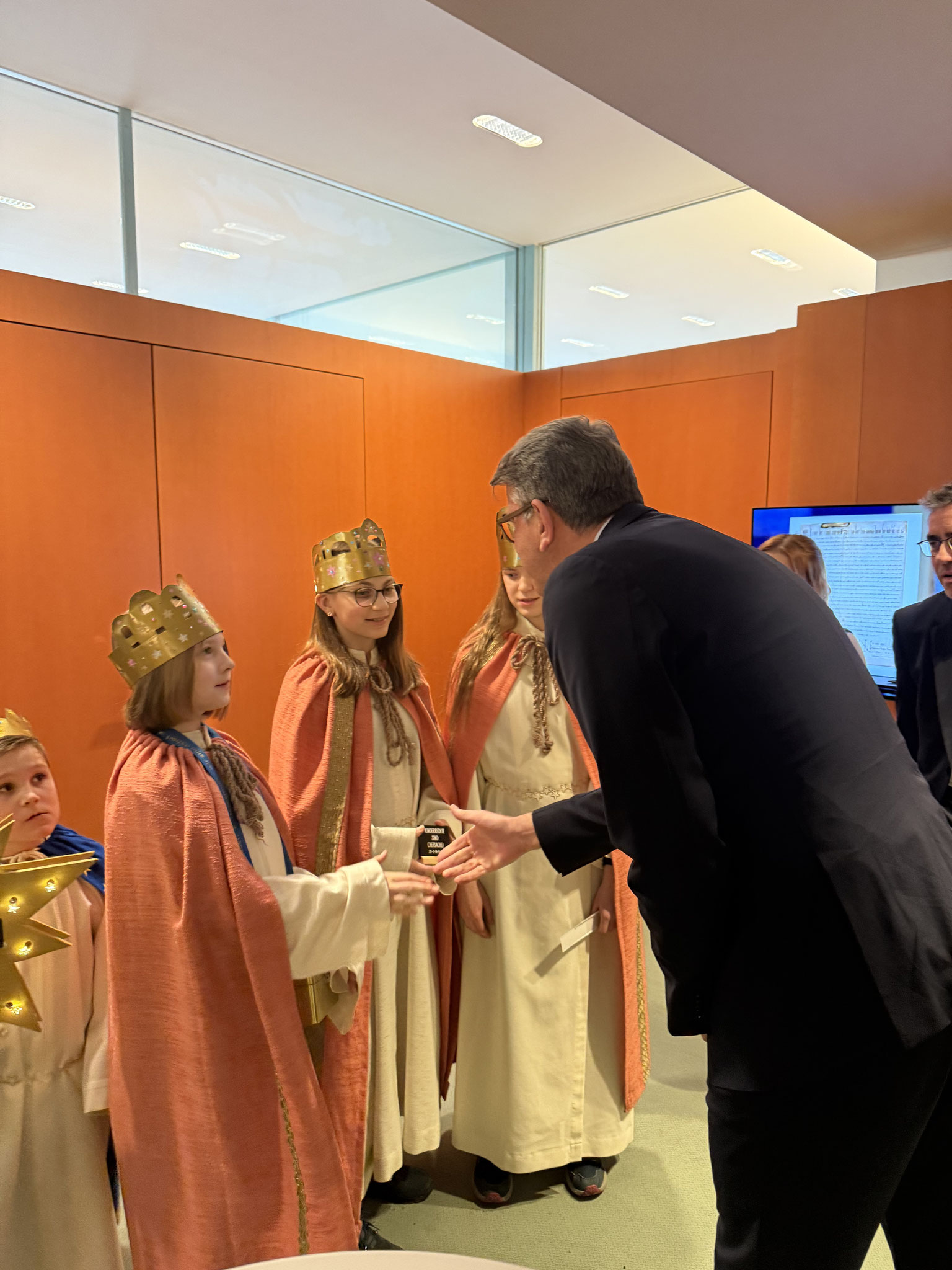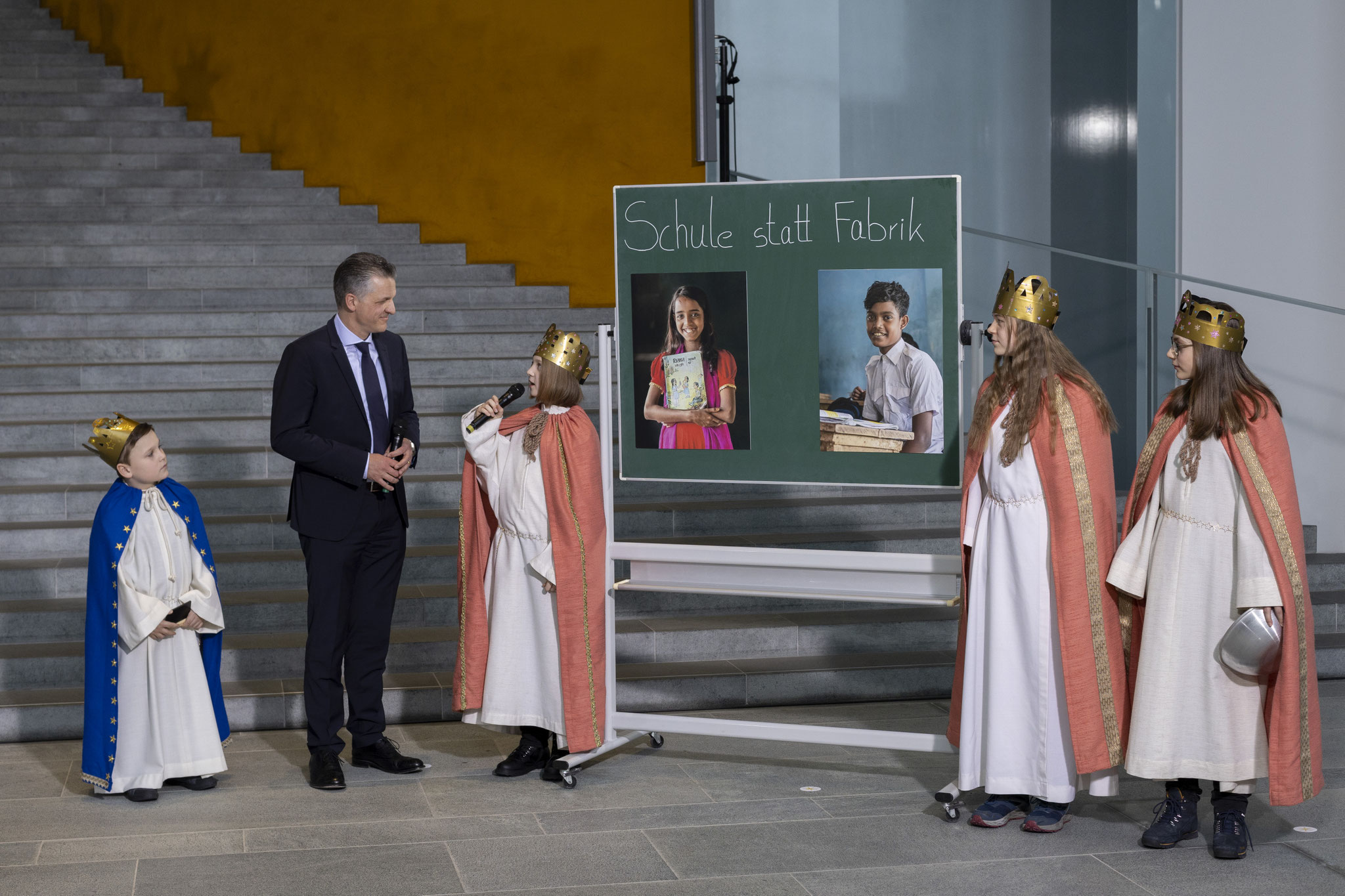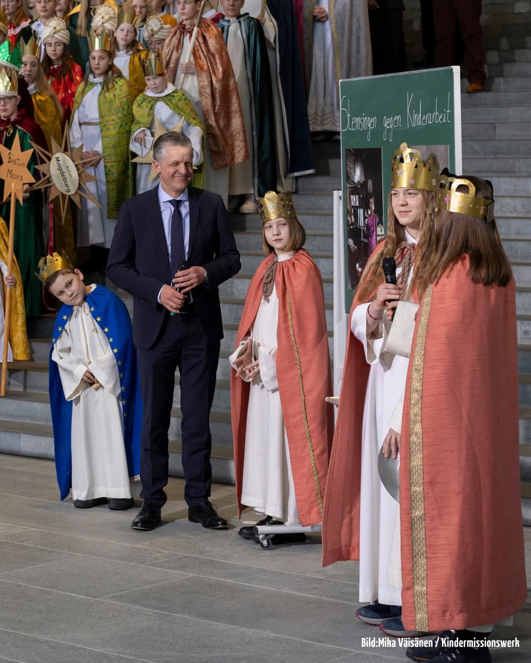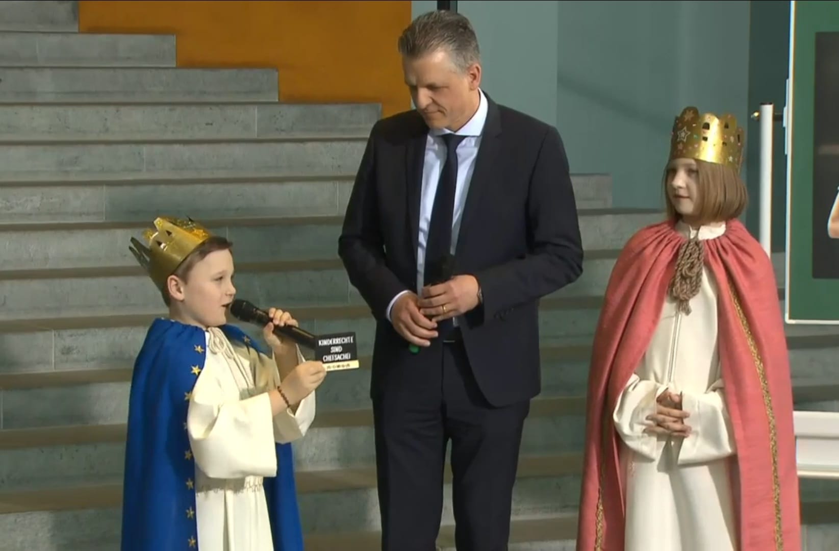 Mit einem kurzen Anspiel machten sie eindrucksvoll auf das weltweite Problem der Kinderarbeit aufmerksam und brachten die klare Botschaft „Kinderrechte sind Chefsache“ ins Kanzleramt. Da Bundeskanzler Friedrich Merz kurzfristig verhindert war, nahm Kanzleramtsminister Thorsten Frei den Segen entgegen und würdigte das Engagement der Kinder. Er betonte die Bedeutung von Bildung als Schlüssel für ein selbstbestimmtes Leben und nannte die Sternsinger*innen Vorbilder für Kinder und Erwachsene.