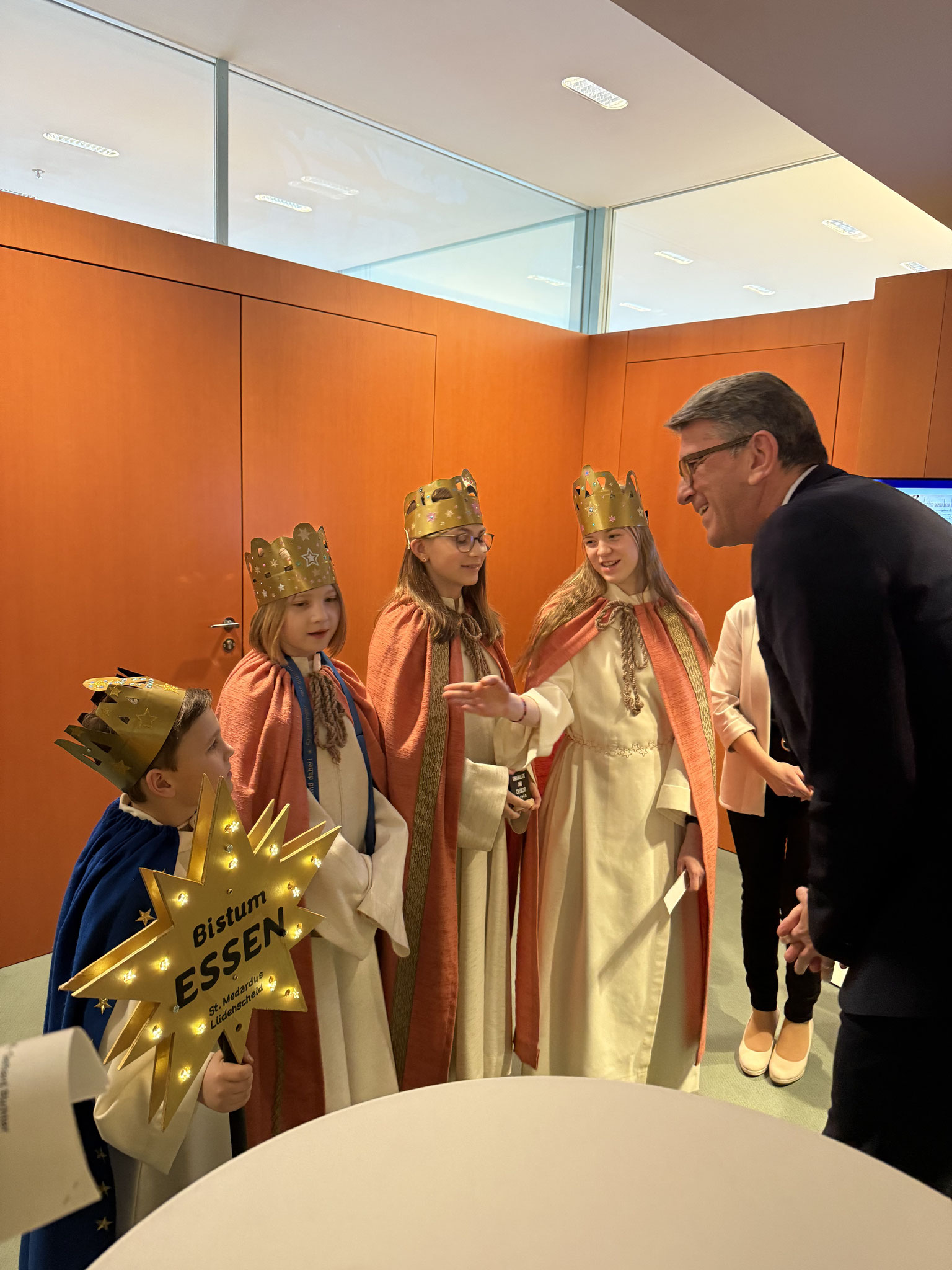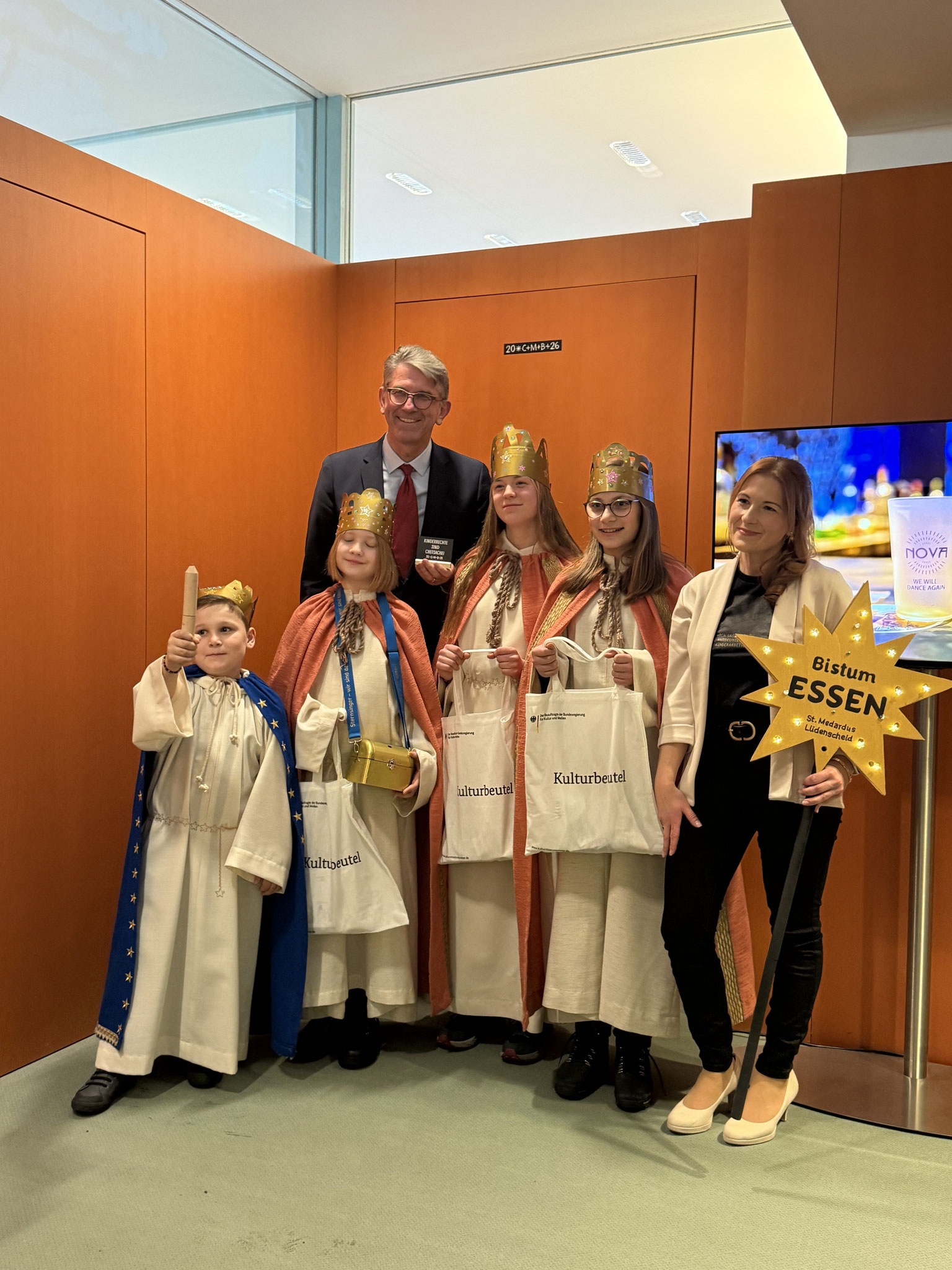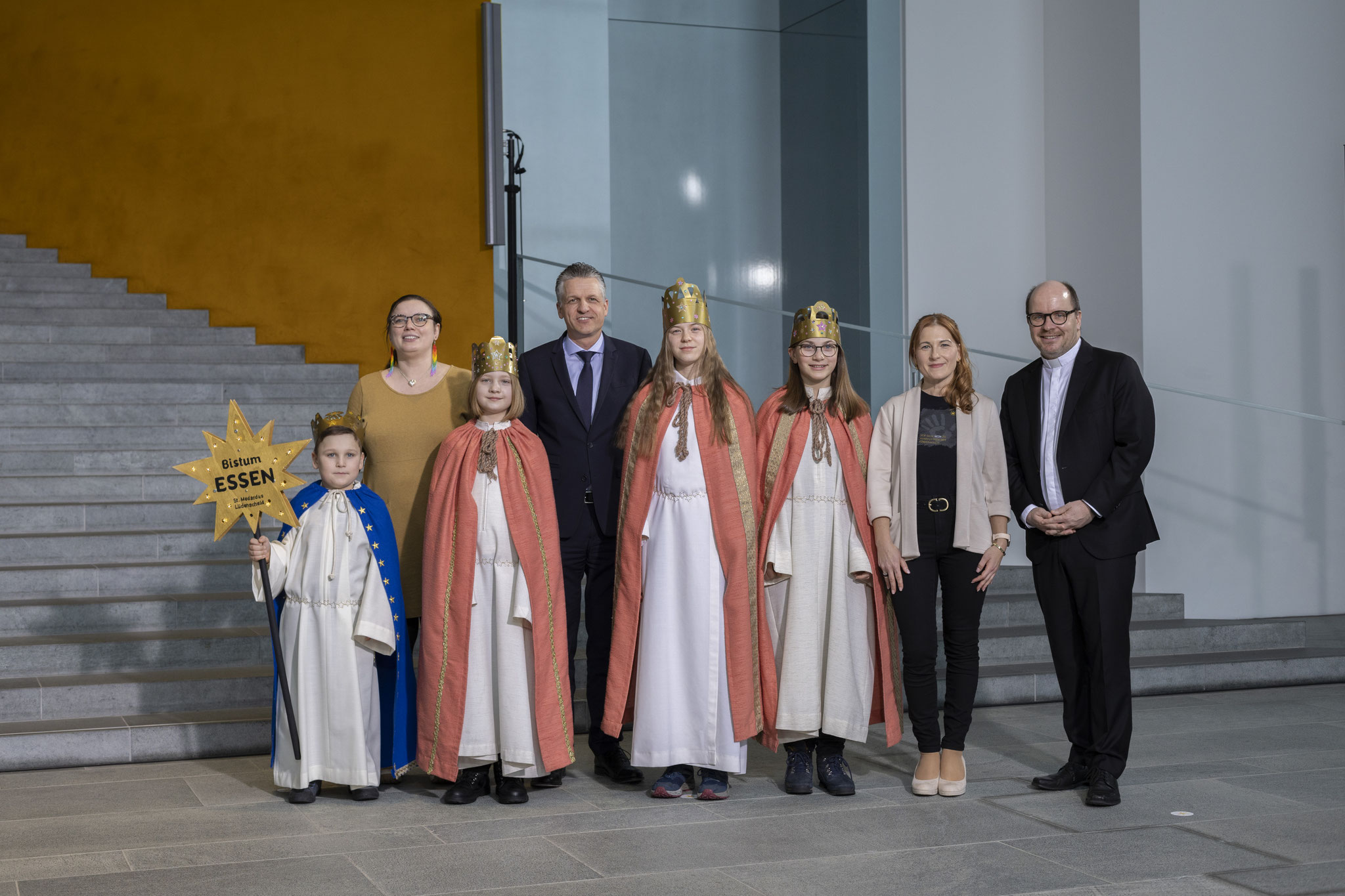 Ein besonderes Kapitel dieser Sternsingeraktion war die Spezialmission unseres „Berliner Quartetts“. Sebastian, Rebecca, Marie und Liuba vertraten unsere Pfarrei und das Bistum Essen beim Sternsingerempfang im Bundeskanzleramt.