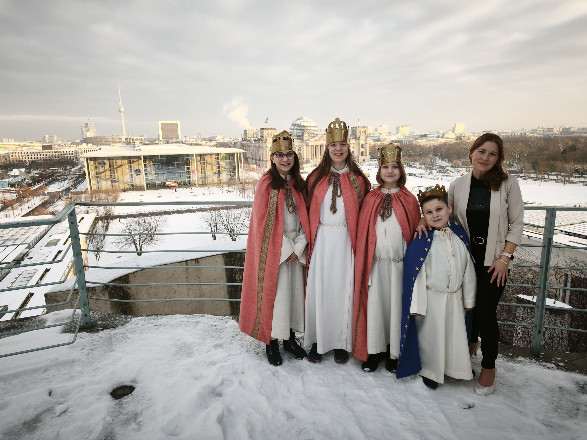 Neben den offiziellen Terminen und einem Sternsinger-Fotoshooting blieb auch ein wenig Zeit, Berlin zu entdecken. Gemeinsam ging es auf zwei kleine Sightseeingtouren durch die Hauptstadt. Als Dankeschön für ihren Einsatz durfte das Berliner Quartett auf den Berliner Fernsehturm fahren. Danach ging es weiter zur Weltzeituhr – und natürlich durfte auch eine echte Berliner Currywurst nicht fehlen.