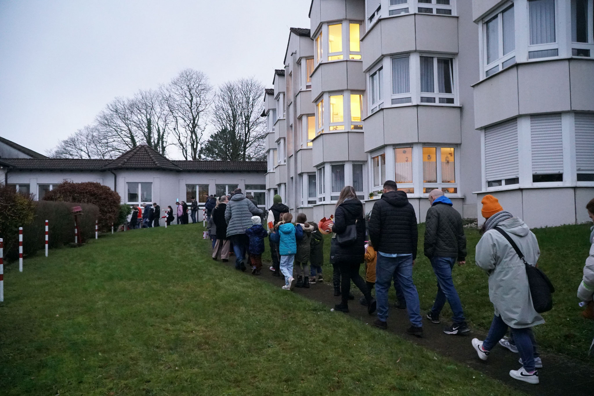 Denn direkt im Anschluss machten sich rund 240 große und kleine Menschen, begleitet von den Bläsern und vielen bunten Laternen, auf den Weg zum Caritas-Altenheim Haus Elisabeth. Im dortigen Garten wurde gesungen, gelächelt und echte Freude verschenkt – ein bewegender Moment der Generationen verband.