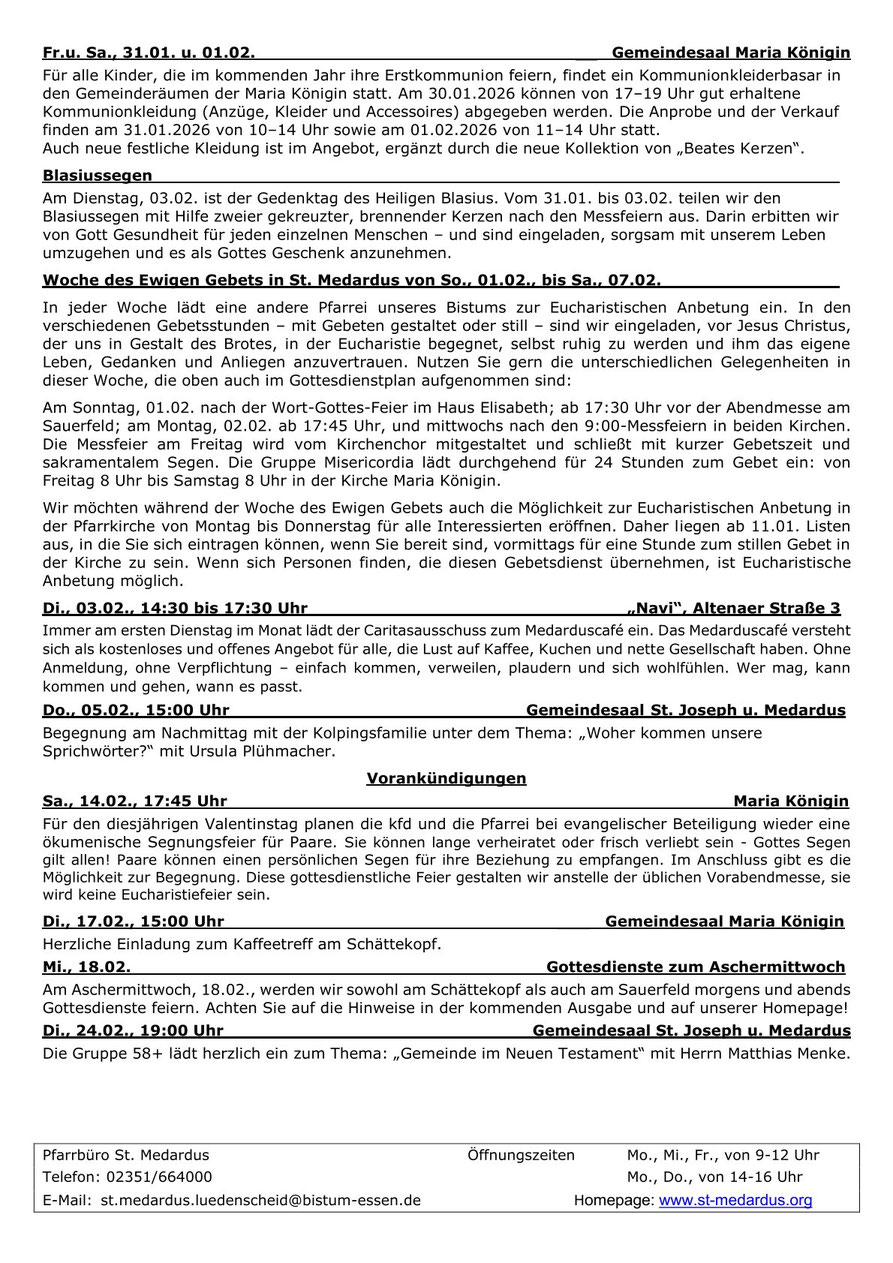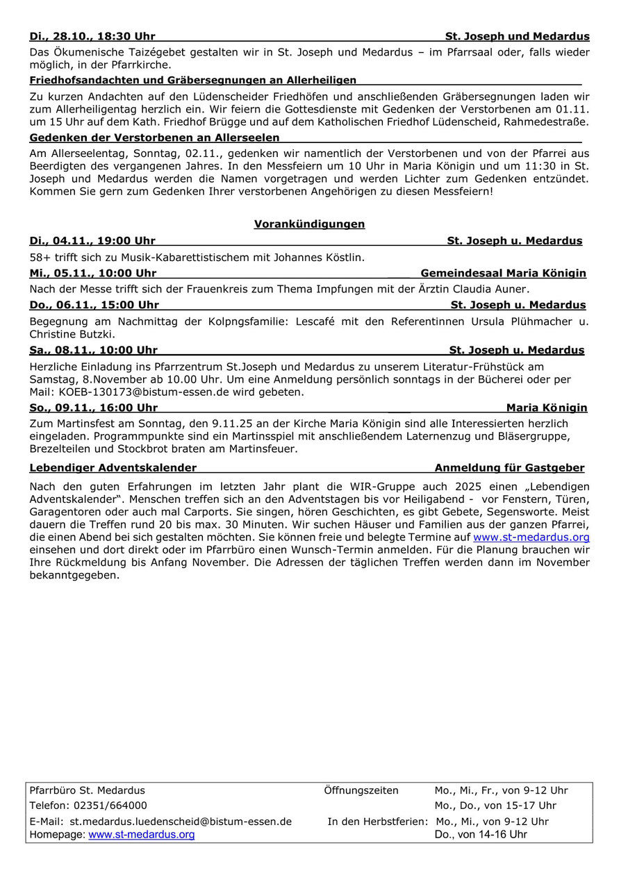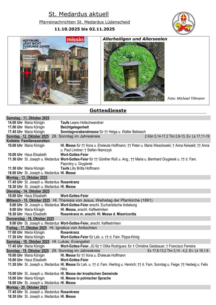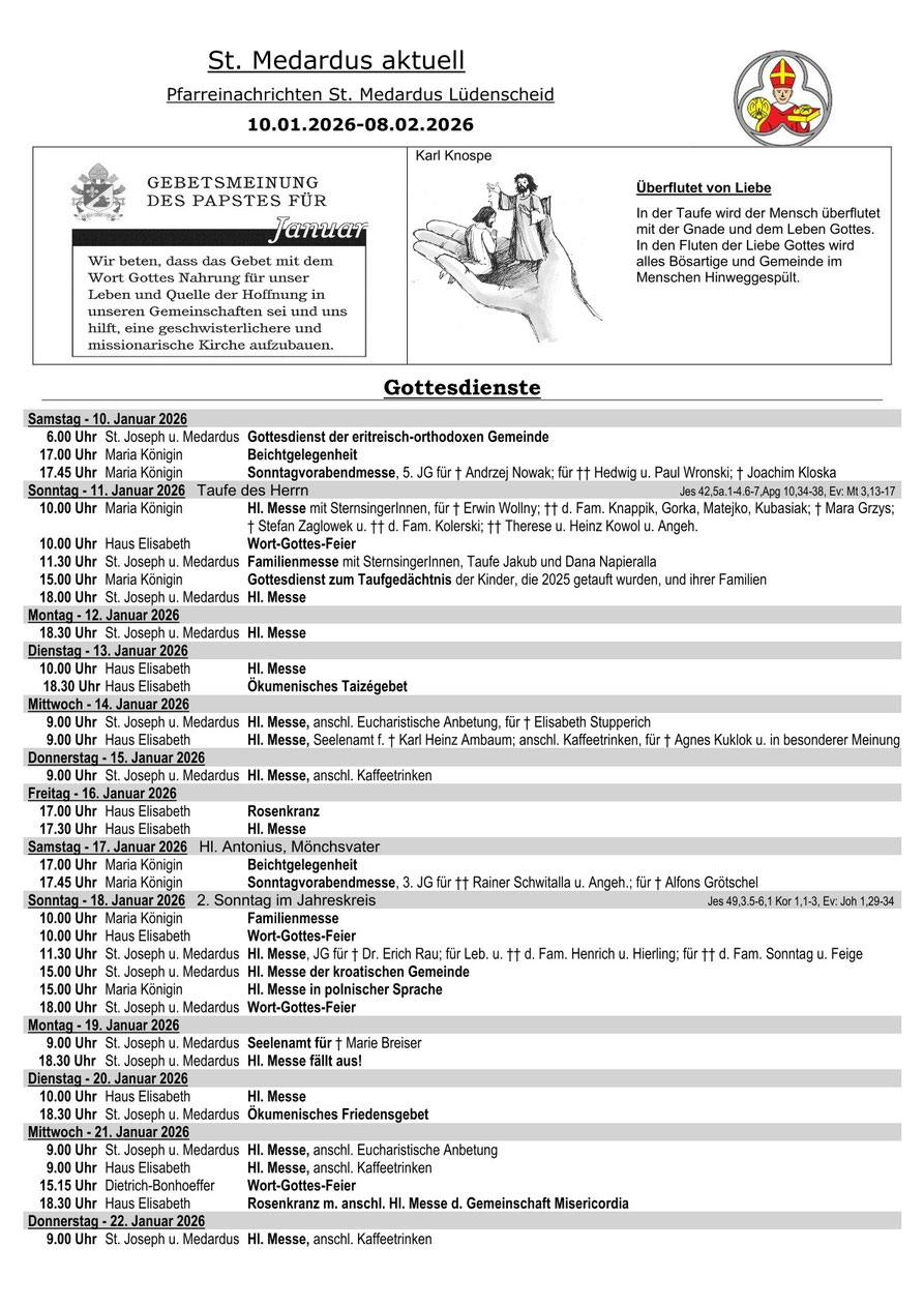 Hier finden Sie unsere Pfarrnachrichten "St. Medardus aktuell", die in aller Regel alle drei Wochen erscheinen. In "St. Medardus aktuell" finden Sie die aktuelle Gottesdienstordnung,
