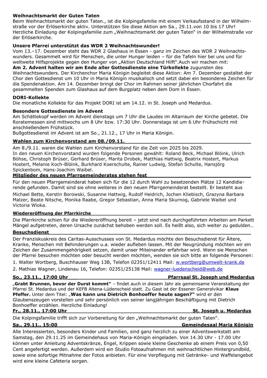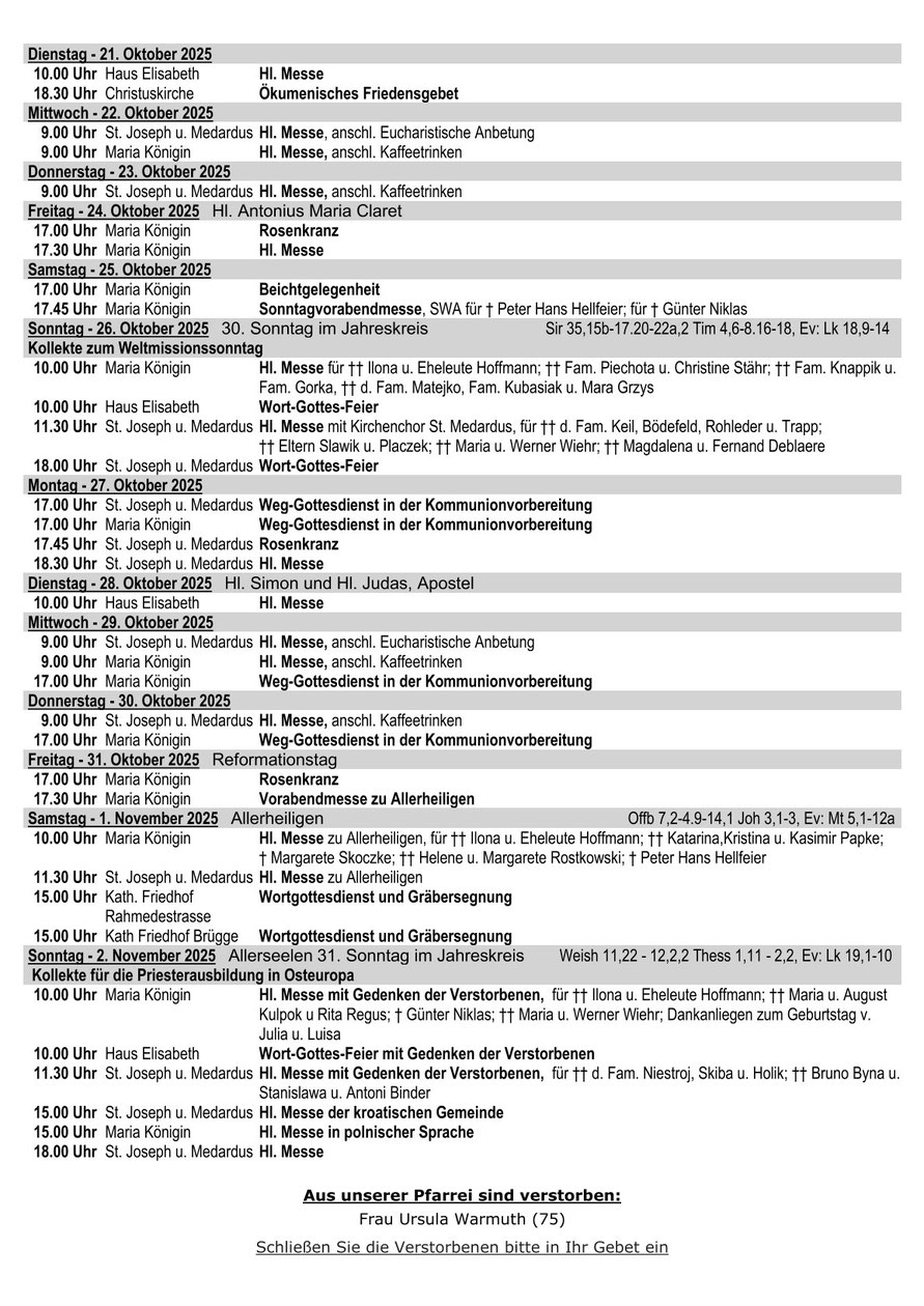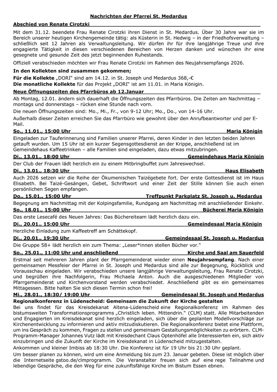 Hier finden Sie unsere Pfarrnachrichten "St. Medardus aktuell", die in aller Regel alle drei Wochen erscheinen. In "St. Medardus aktuell" finden Sie die aktuelle Gottesdienstordnung,